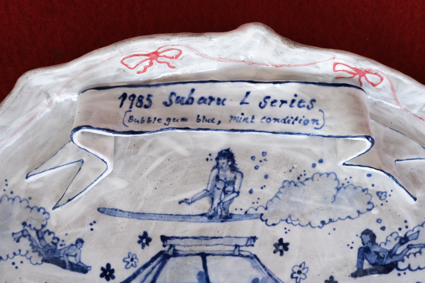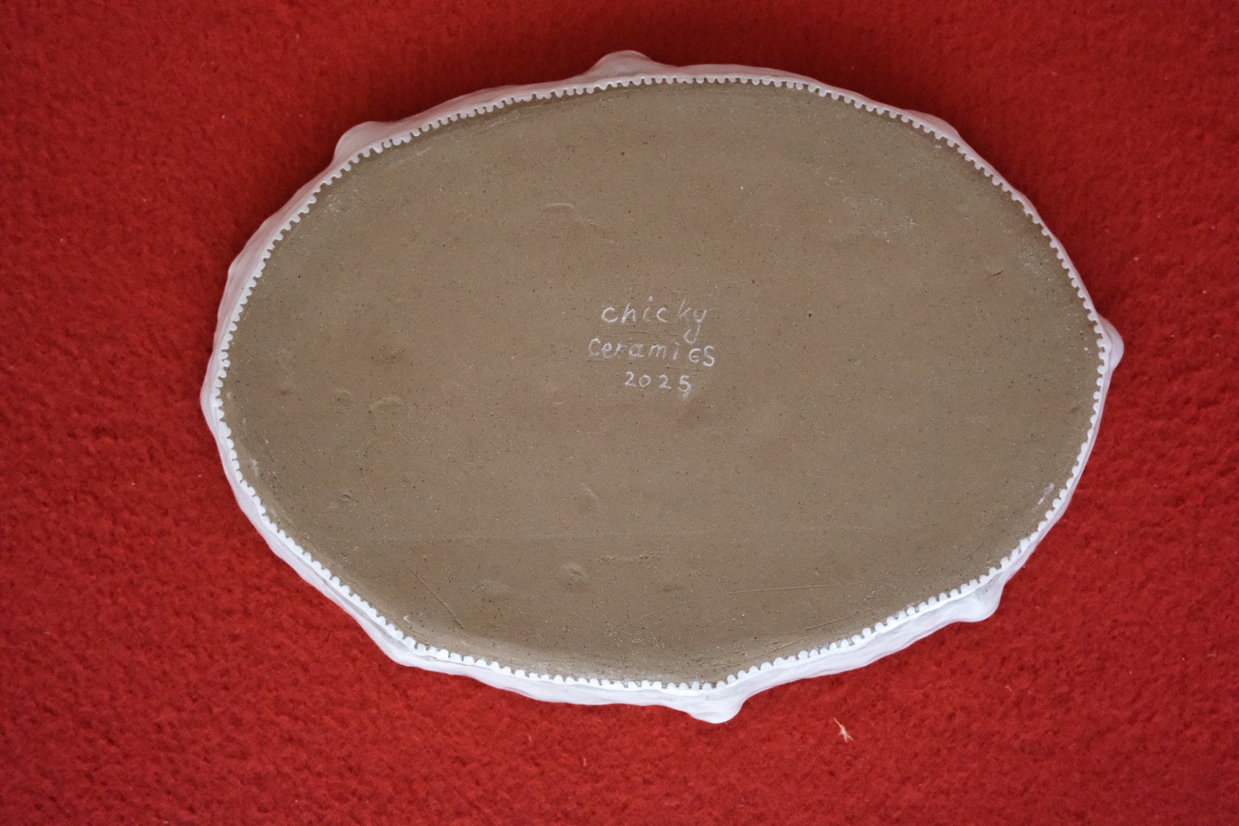 White gaze painted on brown clay with bow detail. Food-safe glaze.